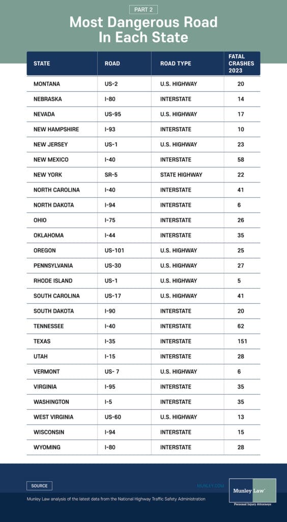 - Deadliest Roads Cluster on Major Interstates and U.S. Routes. I-35 in Texas (151 fatal crashes), US-1 in Florida (131 fatal crashes) and I-5 in California (119 fatal crashes) lead state-level lists.